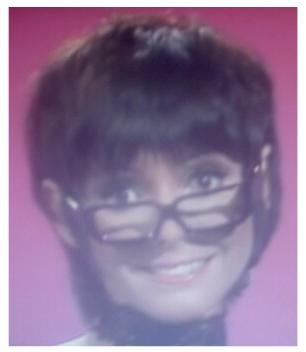 We know of no video to go with this picture - so we're left in suspense over whether a production number might have shaken the hair enough to bring it down, or even expose the forehead. It would be great fun and drama to watch. Now you may understand why we still call her "Super-Cinko."