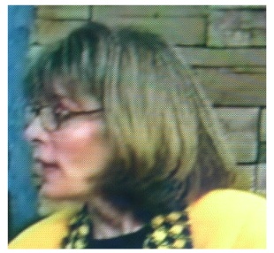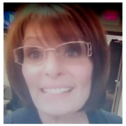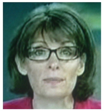 We couldn't find a full picture of her on the station's web site. But this chopped version from the top of the home page indicates she has the classic helmet look we came to admire years ago - temptingly long on the sides, but with well-cut bangs on the forehead. We thank our readers for a wonderful tip!