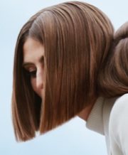 This model is leaning forward because another model is leaning on her neck. The bob comes down, showing precise blunt cutting. But the model saves this center-part look by tucking both sides behind her ears - a simple and obvious, yet key defensive measure.