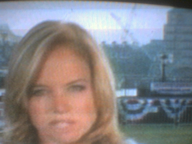 Today broadcast position, at last with her hair unpinned. But it's a breezy day on a concourse, and her