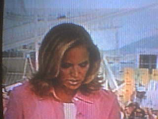 Why didn't Couric tie this hair back? we ask ourselves. We predicted the night before she would, especially given what we saw last week. For many women with Super-Hair, that would have been a no-brainer. Maybe when Couric returns home, some New York tabloid writer will ask her. In the meantime, we'll keep the watch going a few more weeks as a courtesy to her fans.