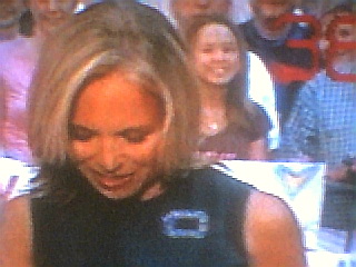 8:00 a.m.: A session with the Olympic mascots (wow, they do have big feet!) shows a breeze blowing hair around on the spectators behind Couric. But with seemingly added curl (you can see it on her left side above), her "hair wall" stays solidly in position even when she dips her head. It's a nice recovery from a shaky start.